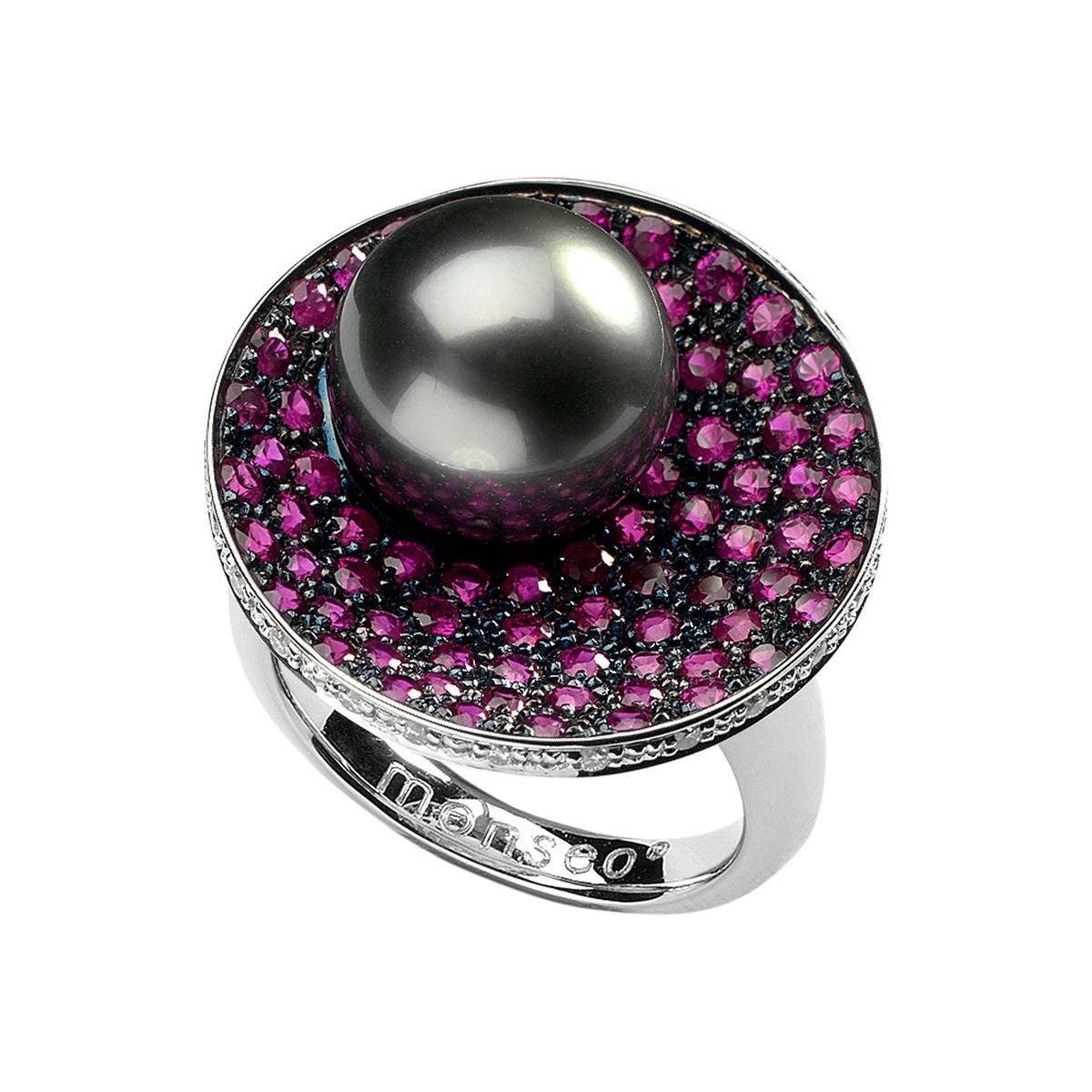 Anel Exotica: Anel em ouro branco 19.2K com 25 diamantes lapidação brilhante com 0.22 ct. 72 rubis com 2.20 ct. e 1 pérola de cultura tahiti 11-12 mm.