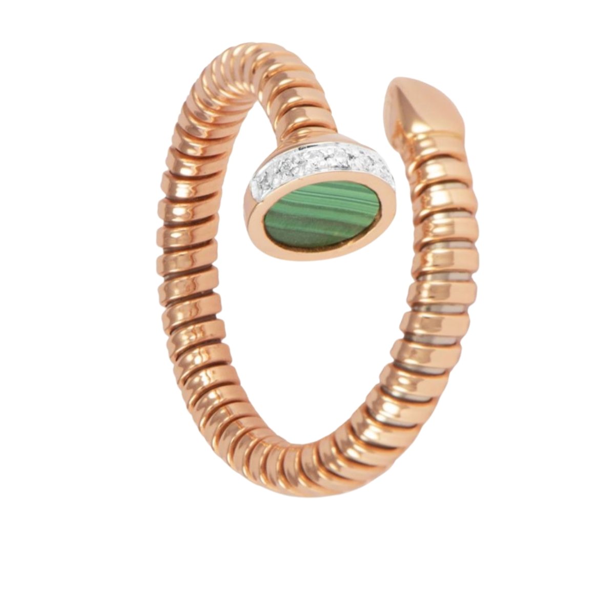 Este anel em ouro 18K, em uma combinação refinada de ouro rosa e branco, destaca a beleza única da malaquite natural, conhecida por suas tonalidades verdes vibrantes. Complementando o design sofisticado, a joia é adornada com 0,07 quilates de diamantes, proporcionando brilho e requinte à peça.