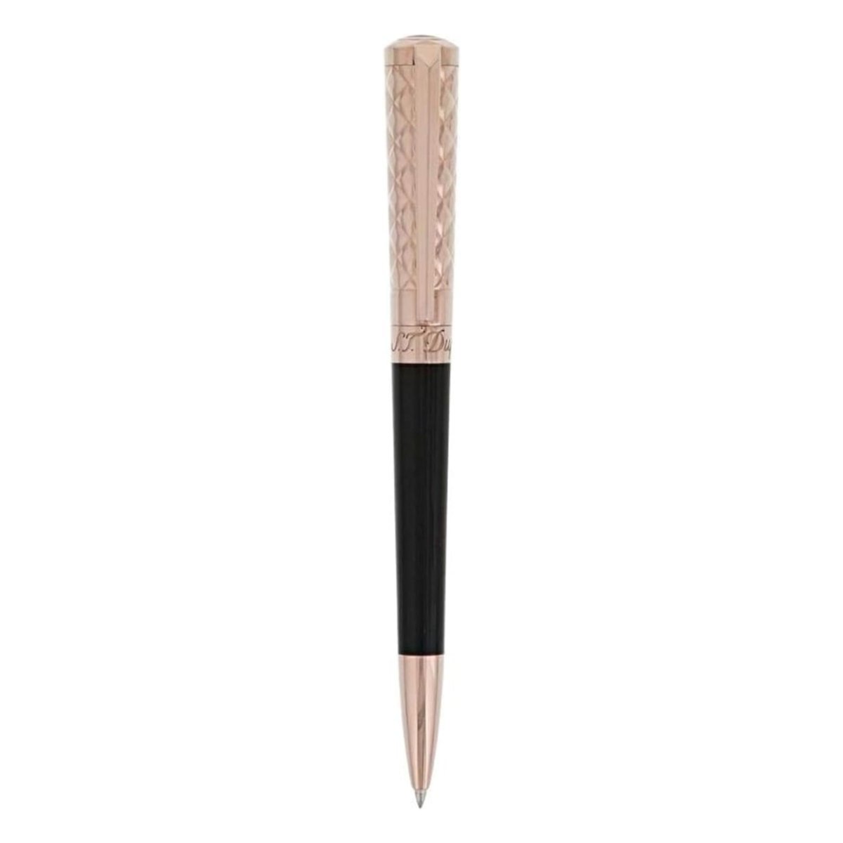 A Caneta Esferográfica S.T. Dupont Liberte 465601 é uma verdadeira obra de arte, com um design sofisticado que mistura laca preta e detalhes em rose gold. Esta caneta é um acessório de luxo que exala elegância, com uma curva sensual e um topo de tampa inspirado no diamante facetado, conferindo-lhe um toque extra de classe e sofisticação.