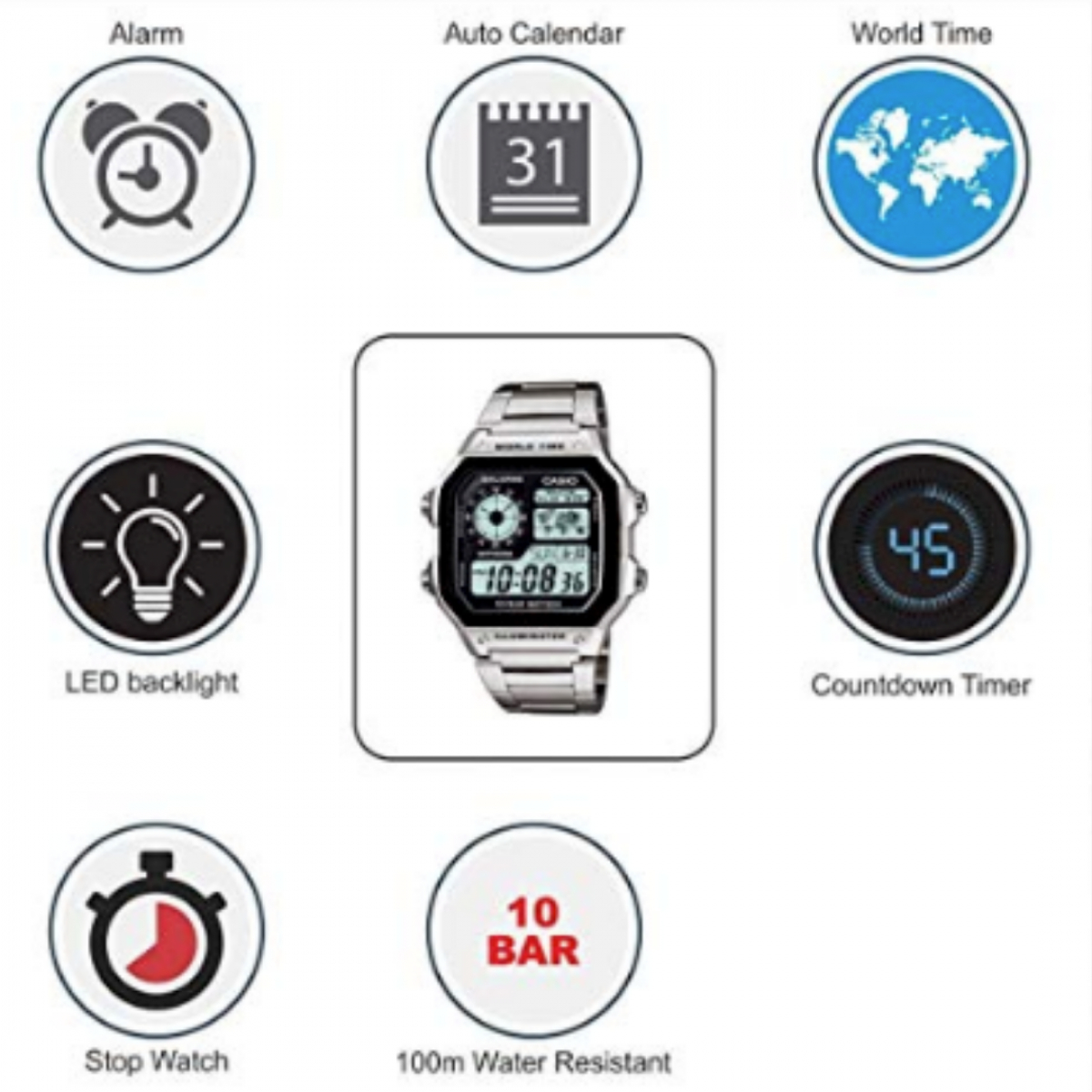 O alarme diário relembra-lhe eventos recorrentes através de um sinal acústico à hora definida. Pode também ativar o sinal horário que indica a passagem de cada hora. Este modelo tem 5 alarmes independentes para lembretes flexíveis de compromissos importantes.