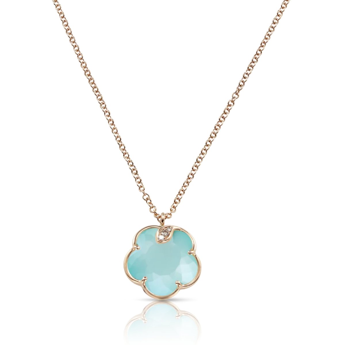 O Colar Petit Joli é uma peça encantadora que celebra a união entre a natureza e a feminilidade, parte da sofisticada coleção Petit Joli. Criado em ouro rosa 18k, este colar exibe uma delicada flor de turquesa e pedra da lua branca (12 mm), complementada por diamantes brancos (0,01 ct) e champagne (0,03 ct), resultando em um design que combina beleza natural e elegância atemporal.