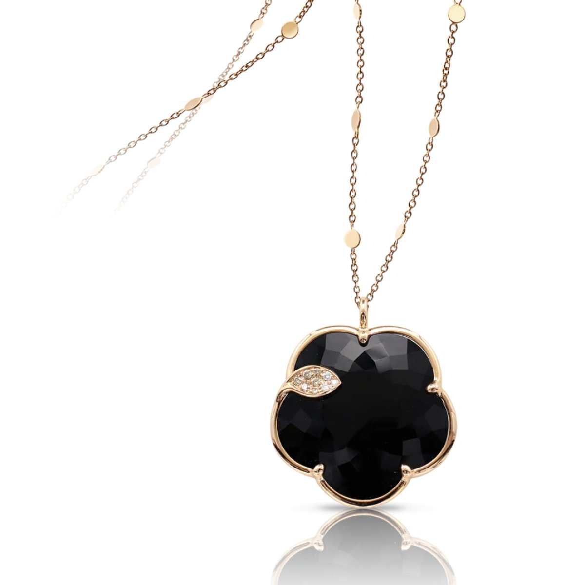 O Colar Ton Joli, da coleção assinada por Pasquale Bruni, é uma expressão sofisticada de feminilidade, força e elegância. Feito em ouro rosa 18k, este colar de 90 cm exibe uma imponente flor de ônix preto (24 mm), envolta por delicadas folhas adornadas com diamantes brancos (0,03 ct) e champagne (0,05 ct), criando um design que une luxo e significado.