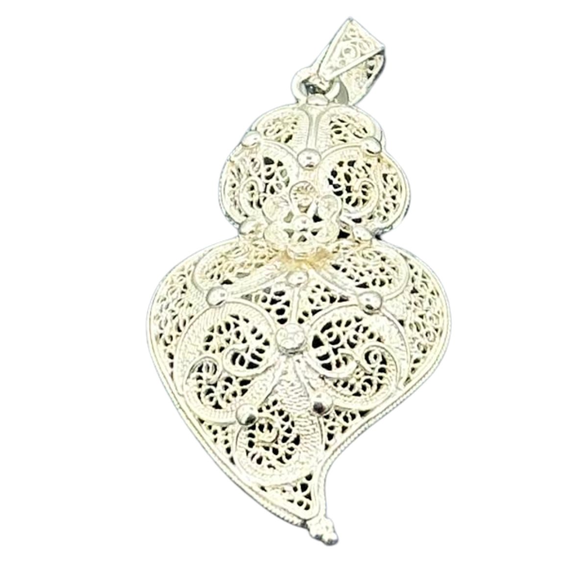 Este coração em prata 925 com filigrana é uma peça elegante e sofisticada, que combina a delicadeza do design artesanal com a durabilidade da prata 925. Com 5 cm de altura e pesando 3,8 gramas, a filigrana artesanal confere um toque de charme e leveza, tornando este coração uma escolha perfeita para ocasiões especiais ou para complementar o seu visual diário. A prata 925 garante resistência e brilho duradouro, enquanto o formato clássico de coração adiciona um toque atemporal à peça. Ideal para quem busca joias refinadas e de alta qualidade, com um design único e elegante.