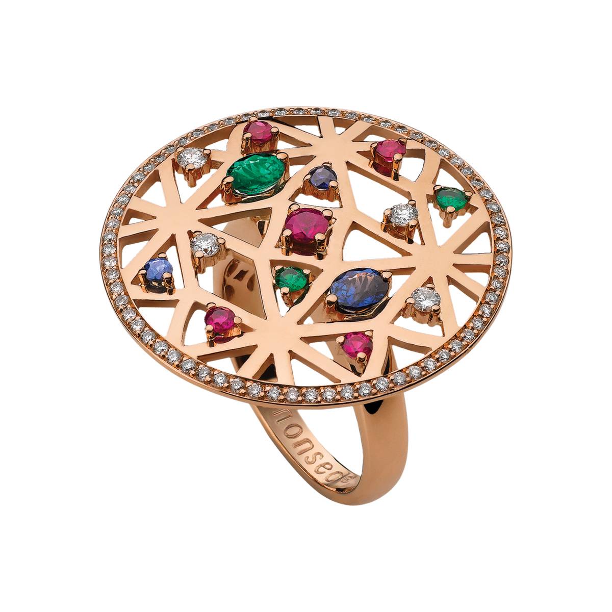 Anel em ouro rosa 19.2K com 72 diamantes lapidação brilhante com 0.39 ct. 1 esmeralda com 0.23 ct. 5 rubis com 0.31 ct. 3 safiras com 0.42ct. e 2 tsavorites com 0.08 ct.