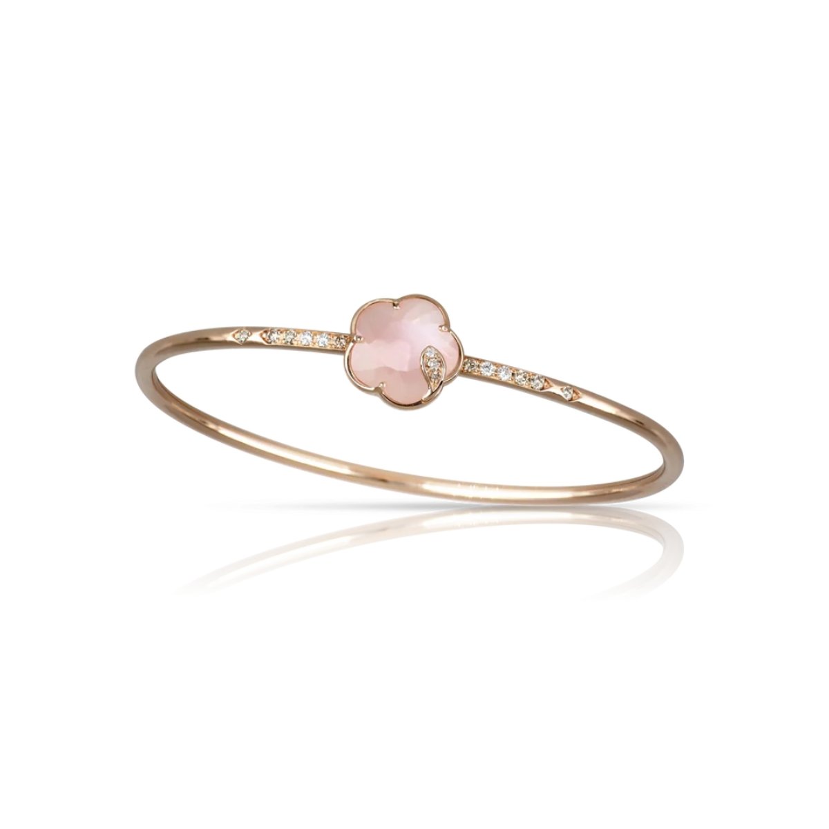 O Bracelete Petit Joli Lunaire, parte da sofisticada coleção Petit Joli, é uma celebração da energia lunar e da conexão feminina com a natureza. Feito em ouro rosa 18k, esta peça apresenta uma delicada flor de calcedônia rosa e pedra da lua branca (12 mm), adornada com diamantes brancos (0,09 ct) e champagne (0,19 ct), criando um brilho encantador e um design que combina beleza e significado.