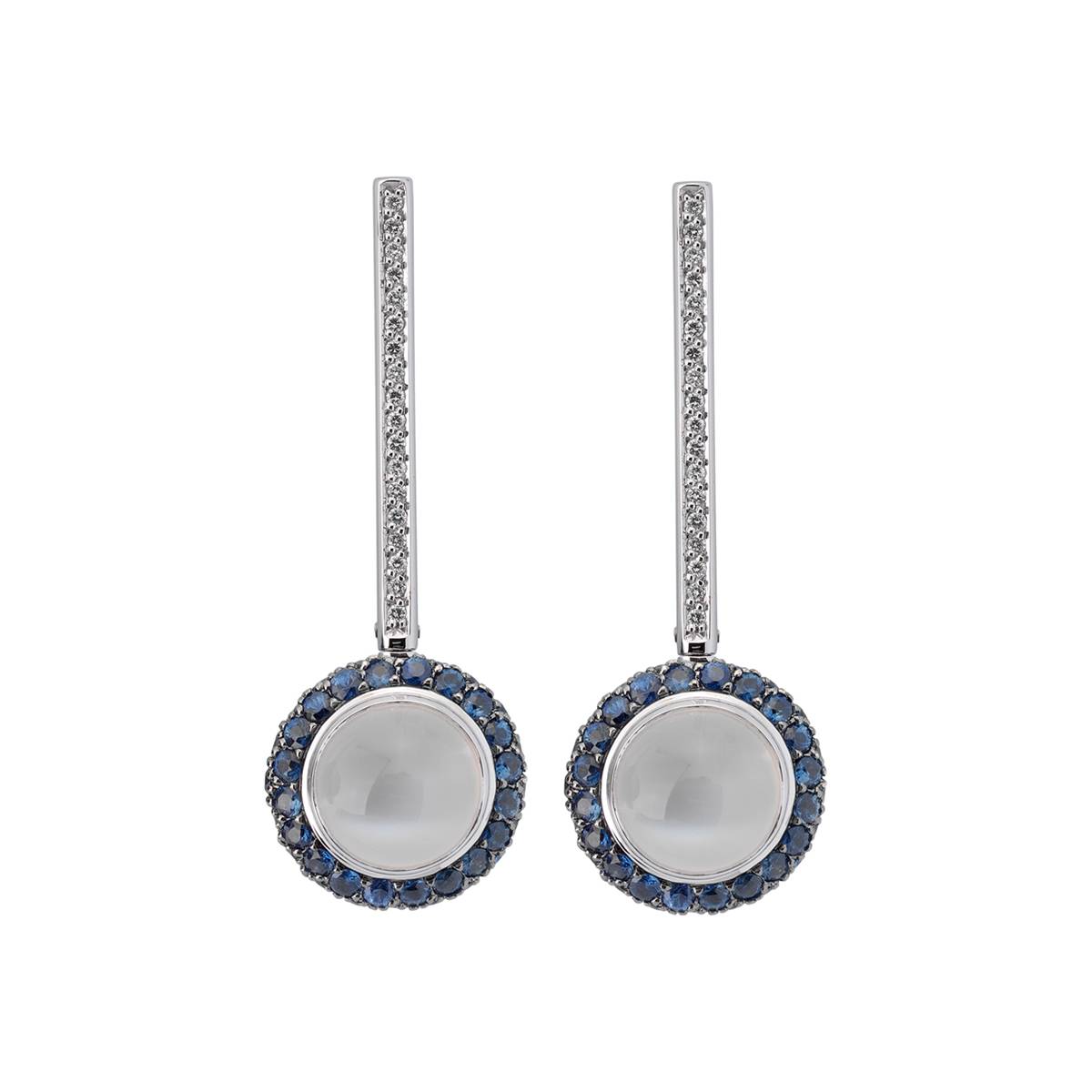 Brincos Apolo: Brincos em ouro branco 19.2K com 36 diamantes lapidação brilhante com 0.22 ct. 178 safiras com 6.15 ct. e 2 pedras da lua.