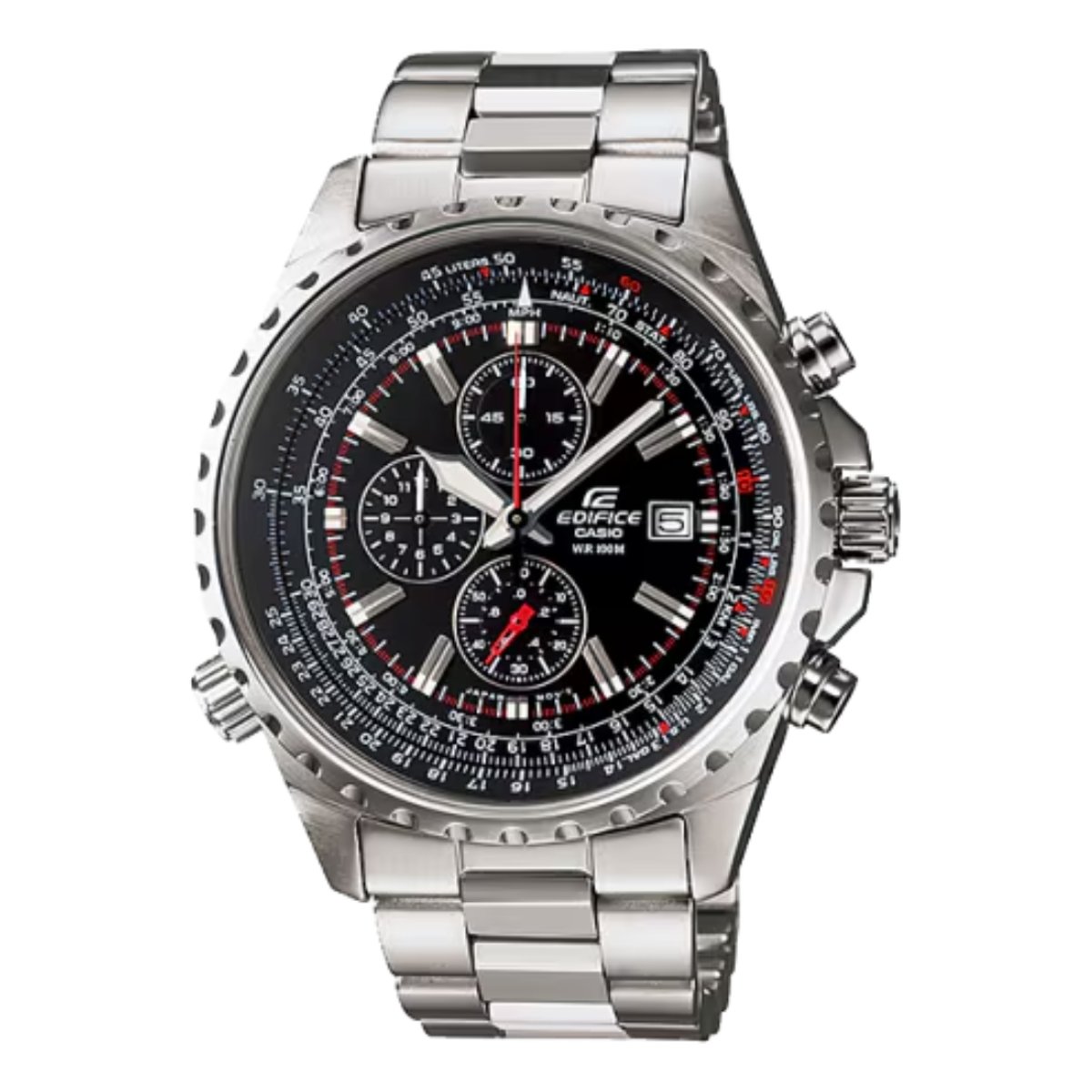 Este modelo apresenta uma régua deslizante integrada, permitindo cálculos precisos e práticos, ideal para medições como velocidade e consumo de combustível, uma característica marcante da linha EDIFICE. A bracelete com segmentos mais pequenos e de forma arredondada proporciona um ajuste confortável ao pulso, garantindo um uso prolongado sem comprometer o conforto. Além disso, a resistência à água de 100 metros torna-o adequado para uso diário, bem como para atividades aquáticas leves.