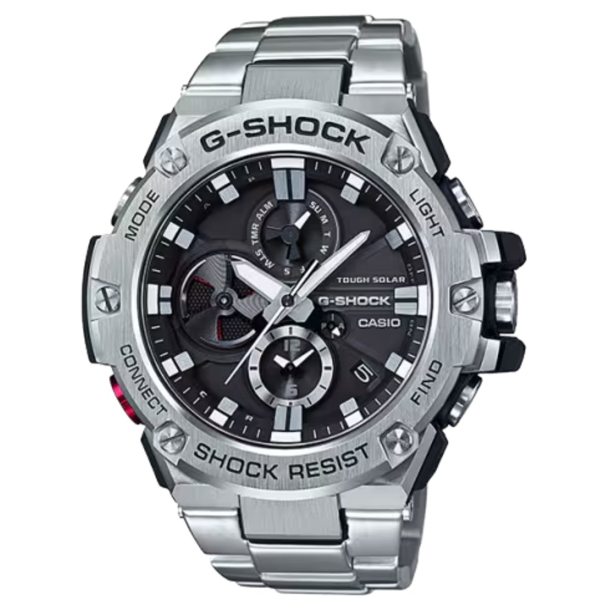 Com conectividade Bluetooth®, o GST-B100D-1A permite a sincronização precisa da hora com um smartphone. A tecnologia Tough Solar garante um funcionamento eficiente e contínuo, enquanto a retroiluminação LED de alto brilho assegura excelente visibilidade em qualquer ambiente. Além disso, o relógio possui a função de duas horas mundiais, ideal para quem viaja com frequência.