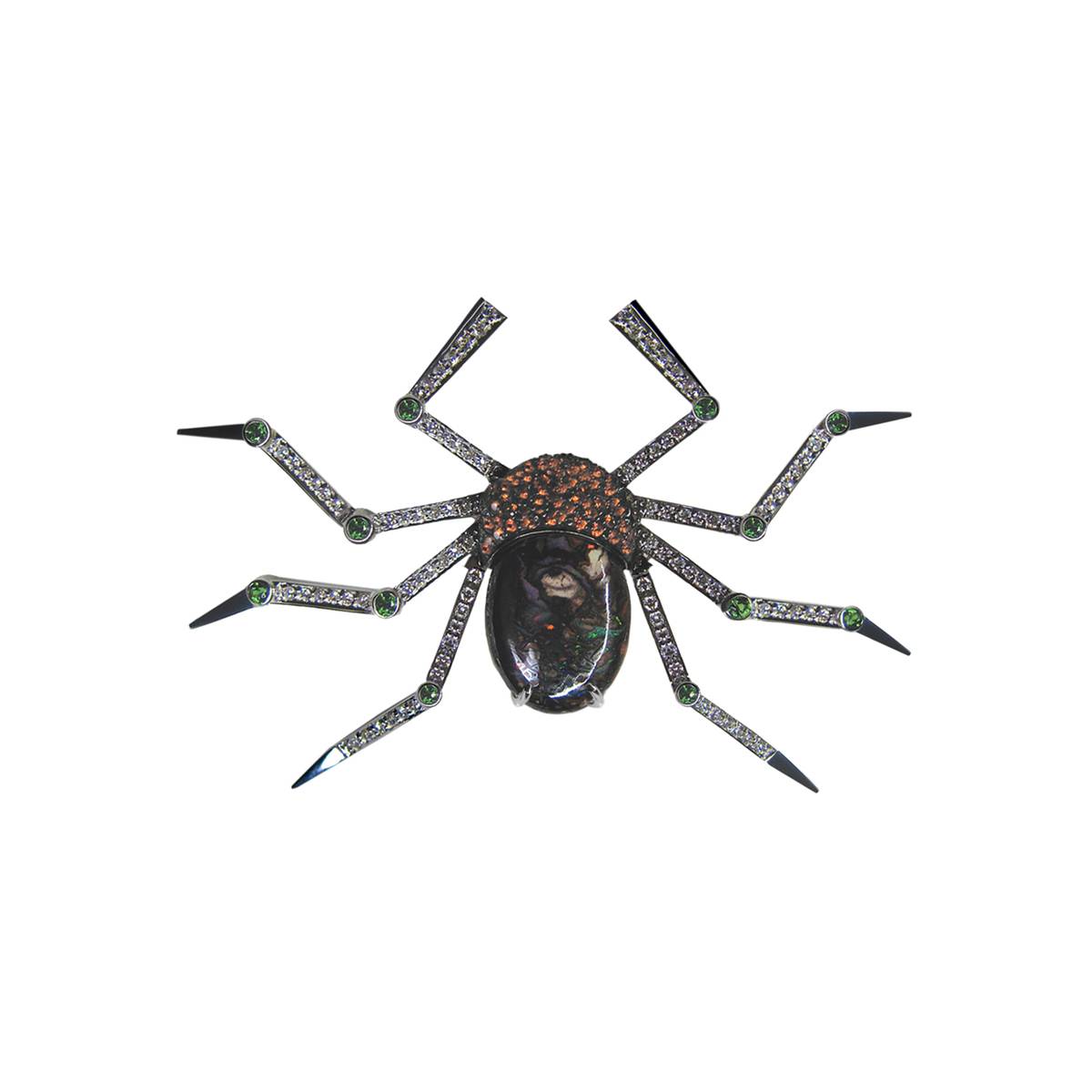 Alfinete Secret Garden: Alfinete em ouro branco 19.2K com 96 diamantes lapidação brilhante com 0.75 ct. 12 tsavorites com 0.55 ct. 64 safiras laranja com 0.66 ct. e 1 opala com 9.13 ct.